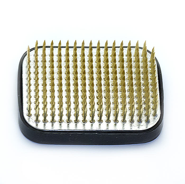 Prostokątny kenzan, czyli "jeżyk "do japońskiej sztuki układania kwiatów - Ikebany. Dzięki użyciu odpowiednich stopów metali jest ciężki, a jego kolce są bardzo ostre. Pozwala to ułożyć kwiaty pod dowolnym kątem i stabilizuje naczynie. Utrzyma nawet ciężkie rośliny. Dzięki kauczukowej podstawce nie ślizga sie po dnie wazonu.