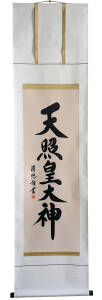 Shinto było pierwotną religią religią w Japonii przed przybyciem buddyzmu do tego kraju. Dziś oba kierunki duchowe współistnieją razem w codziennym życiu. Znaki, które składają się na japońskie słowo oznaczające Japonię, oznaczają „pochodzący ze Słońca”; lub „Królestwo Słońca”. Pismo na tym zwoju pochodzi z sintoizmu i czci Słońce jako centralną boską zasadę i źródło wszystkiego.
